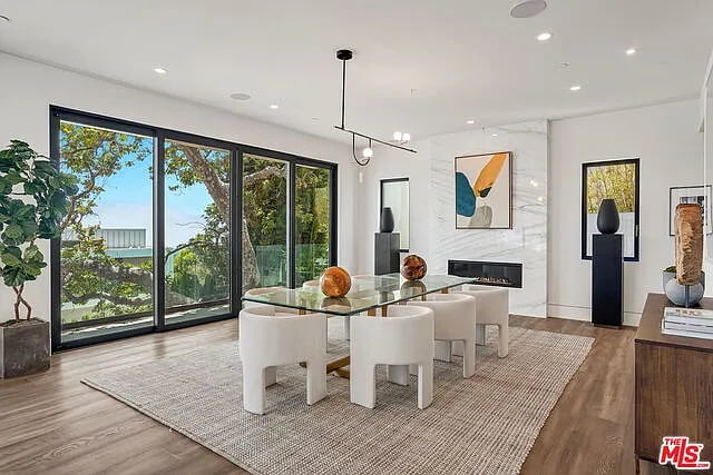 New Upper Riviera Warm Modern View Home. Enter sophistication; a two-story foyer with a wall of limestone, skylights and a floating wood tread, glass rail staircase. Great room with gorgeous city views, a full bar, granite fireplace and a powder room that leads out to the rear pool/spa area. Multi-sliding doors open to an entertainment front view patio. Gourmet, modern chef's kitchen with a large island and a butcher block seating area that is open to formal dining space and nook area. Lower level has a state-of-the-art large home theater, a climatized wine cellar and tasting area, a work out room with sauna and bathroom, a guest suite and a large laundry room. An oversized 3-car garage and ample storage completes this level. Take the 4-stop elevator to the 3rd level and hold your jaw from dropping at the panoramic view, A Master suite with large steam shower plus 3 bedrooms and an executive office complete this level. The rooftop deck has views from the Getty museum to Catalina Island.