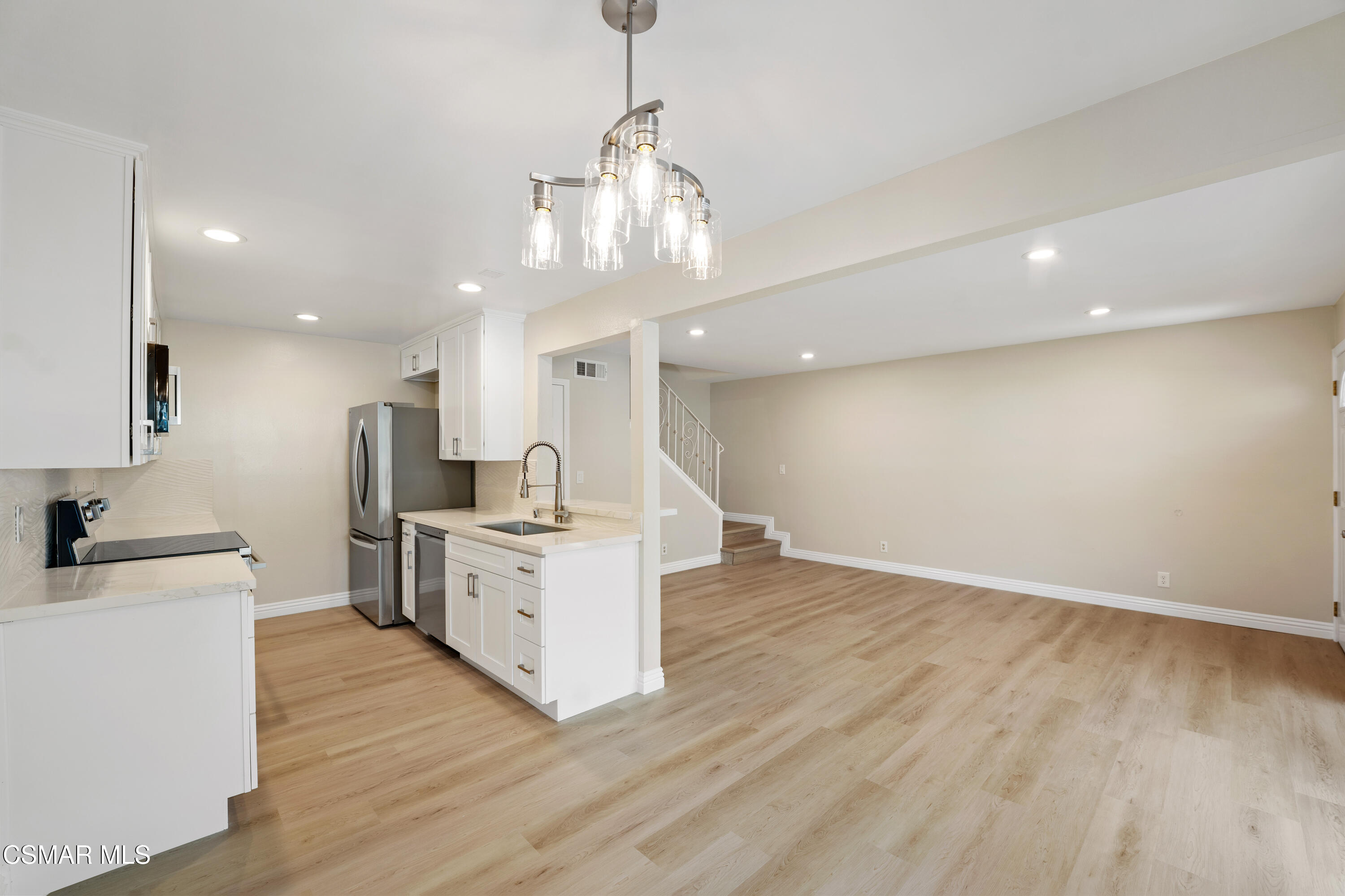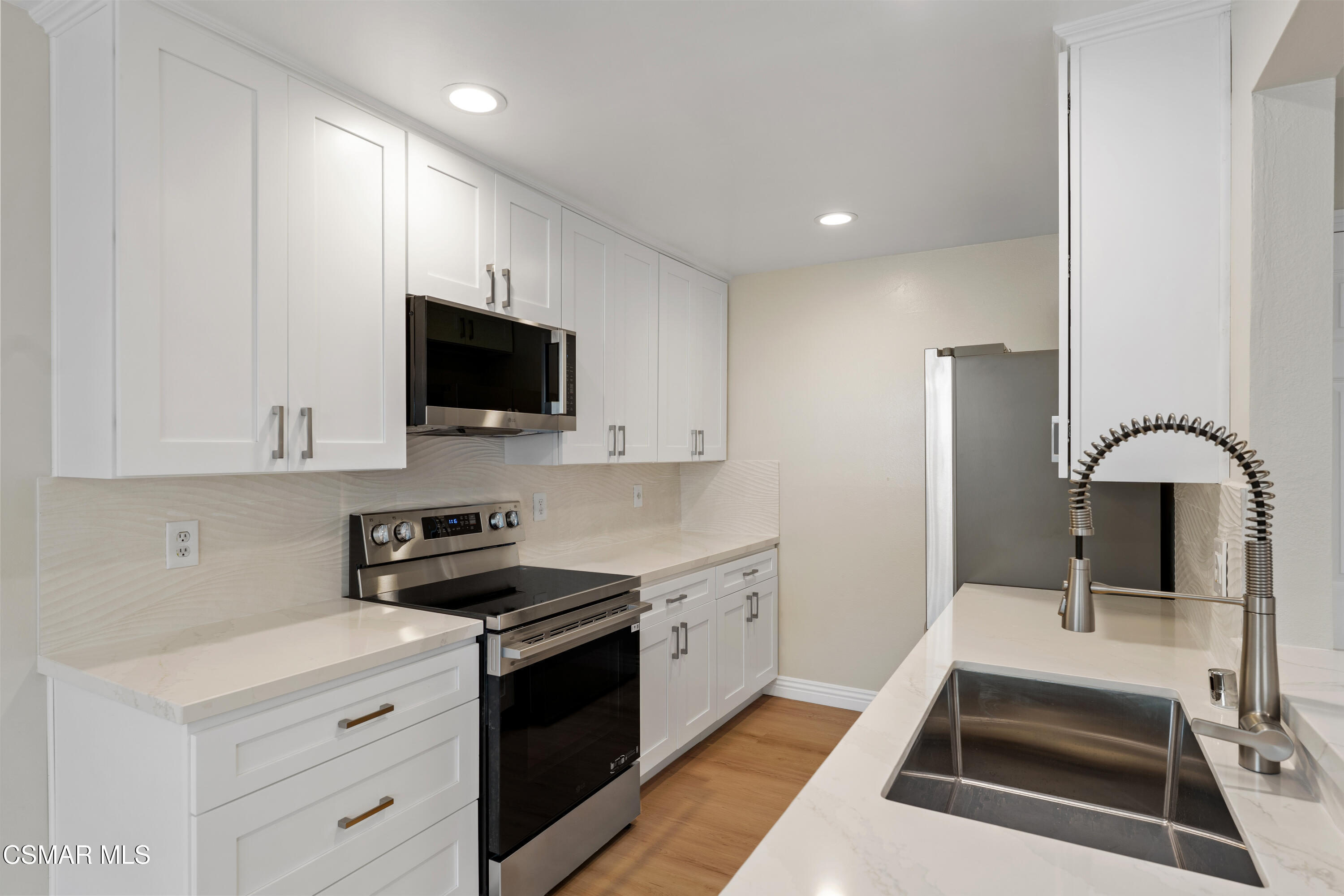 Location, Lifestyle, and Modern Living in Westlake Village. Perfectly situated in the highly desirable Village Green community, this beautifully remodeled end-unit offers the ideal combination of comfort, convenience, and contemporary style. Just a short walk from Westlake Lake, scenic greenbelts, the local farmer's market, and vibrant shopping and dining, this residence truly captures the essence of Westlake Village living. Inside, no detail has been overlooked. The home features all-new premium wood-like flooring, dual pane vinyl windows, and modern recessed lighting throughout, creating bright and inviting spaces. The remodeled kitchen boasts stainless steel appliances and a sleek contemporary design, seamlessly opening to the spacious living area. The bathroom has been thoughtfully upgraded with a frameless glass shower enclosure and a new modern vanity, offering both style and functionality. Two well-appointed bedrooms provide comfort and privacy, while the open floorplan enhances the flow of natural light. Large sliding doors lead to a private patio, perfect for relaxing or entertaining. Additional highlights include in-unit laundry, a semi-attached one-car garage with storage, an adjacent dedicated parking space, and community amenities such as pools, spas, basketball court, lush greenbelts and included water and trash services. Whether you're a first-time buyer, downsizing, or looking for an investment, this fully updated condo is a rare opportunity to enjoy modern living in one of Westlake Village's most sought-after neighborhoods.
